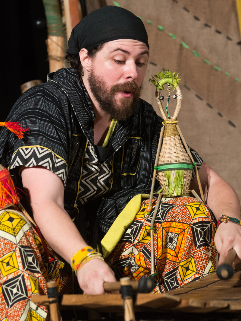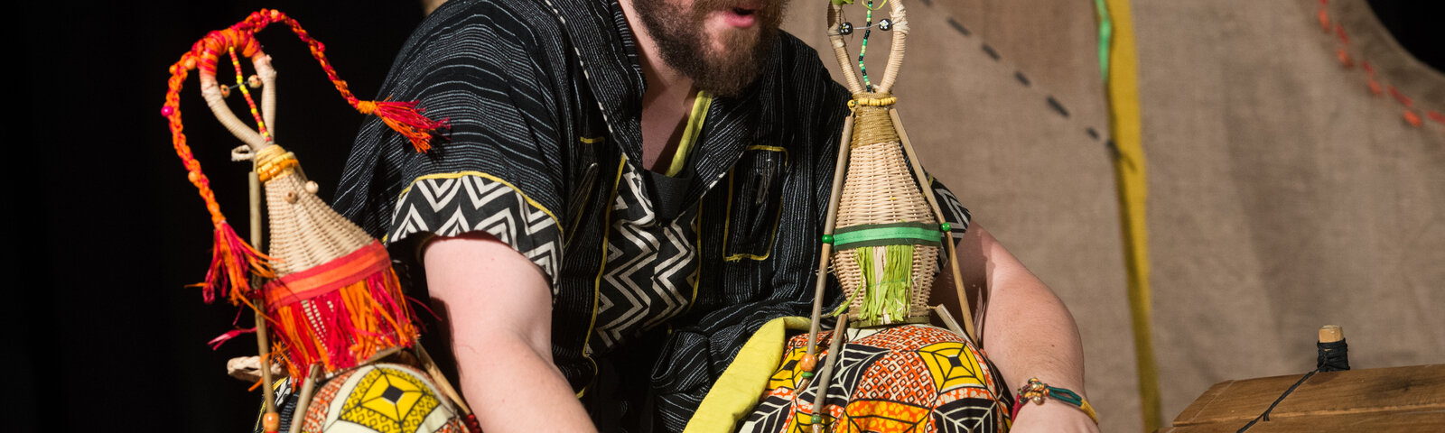 🥁 A mesevilág különlegessége, hogy a zenélő varázsló mellett „maguk a dobok beszélnek”, így a ritmus a történet szereplőjévé válik. A zenei és tárgyjáték elemek élőben építik fel Dzséli kunyhójának világát.